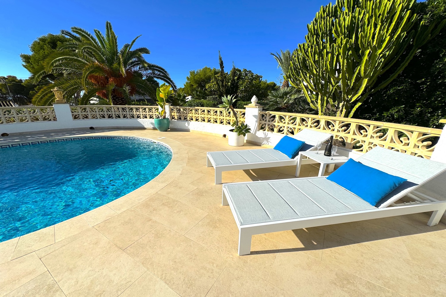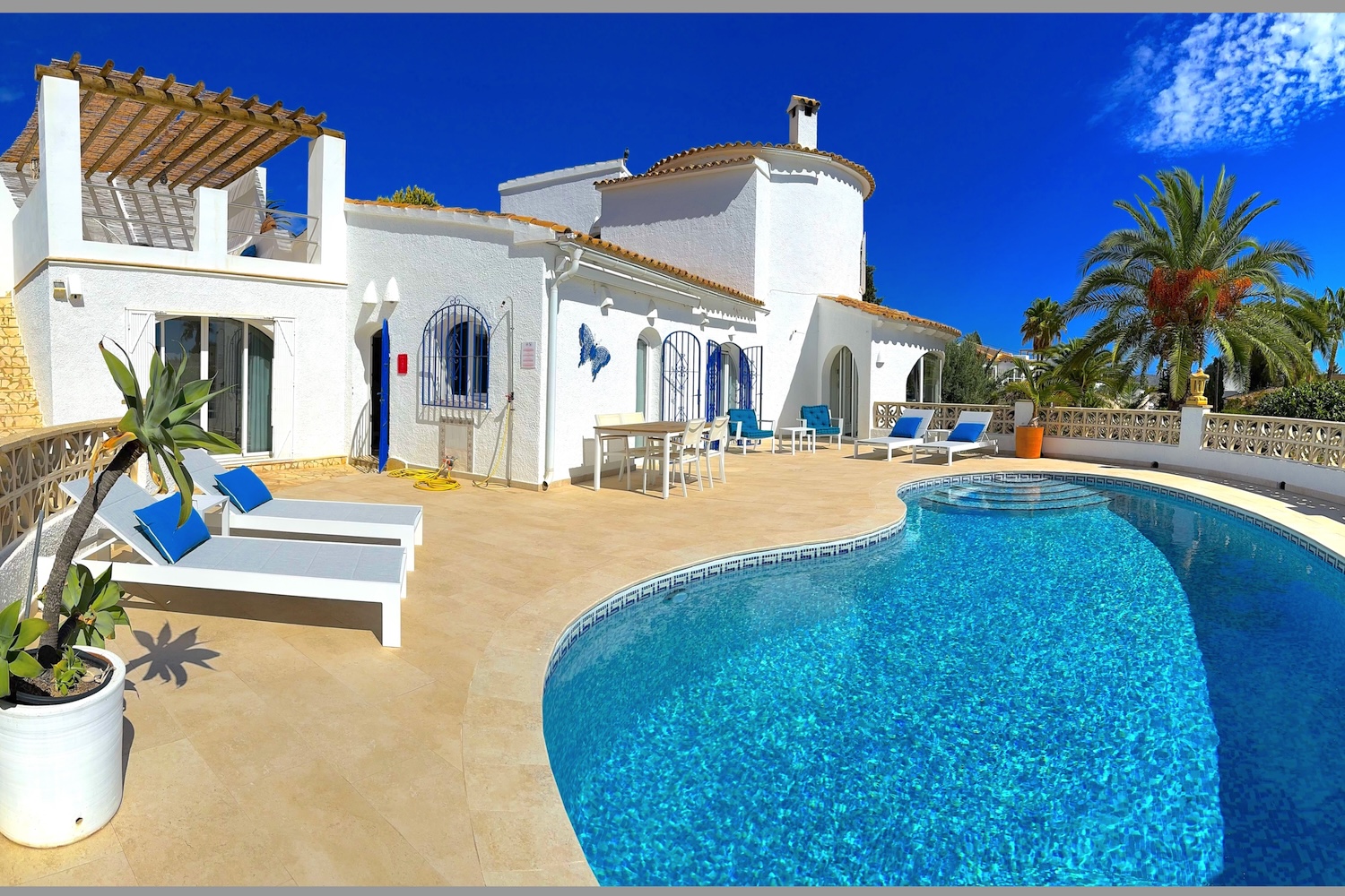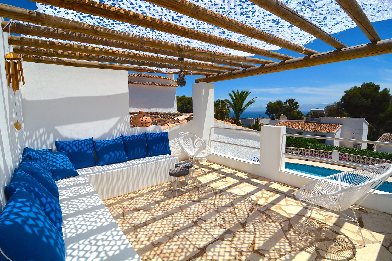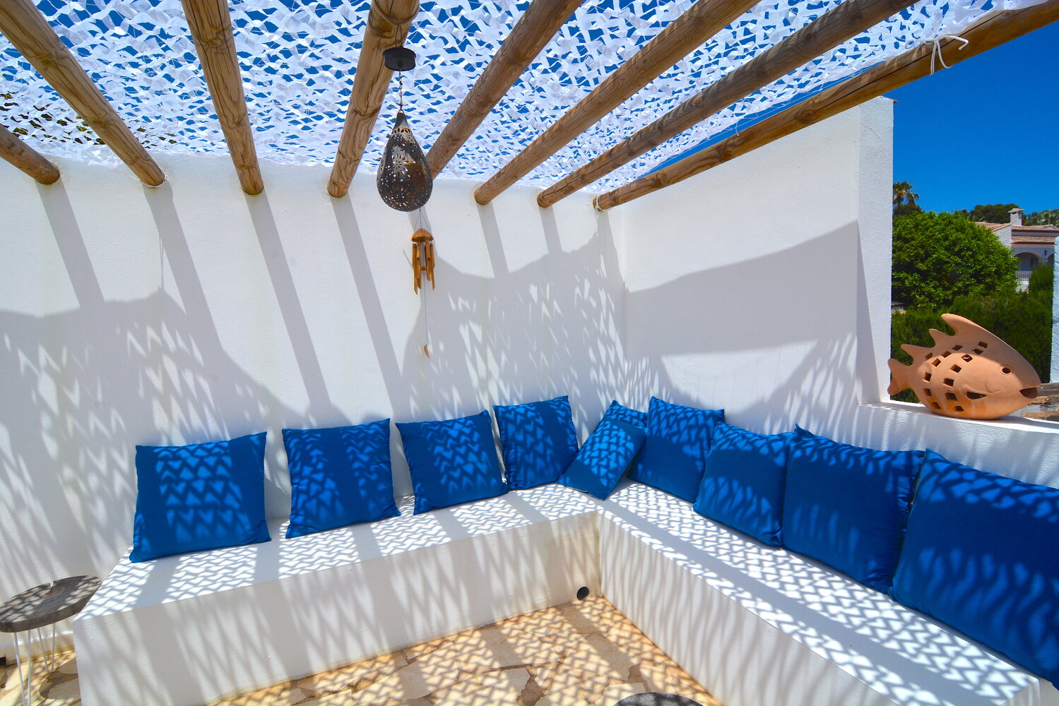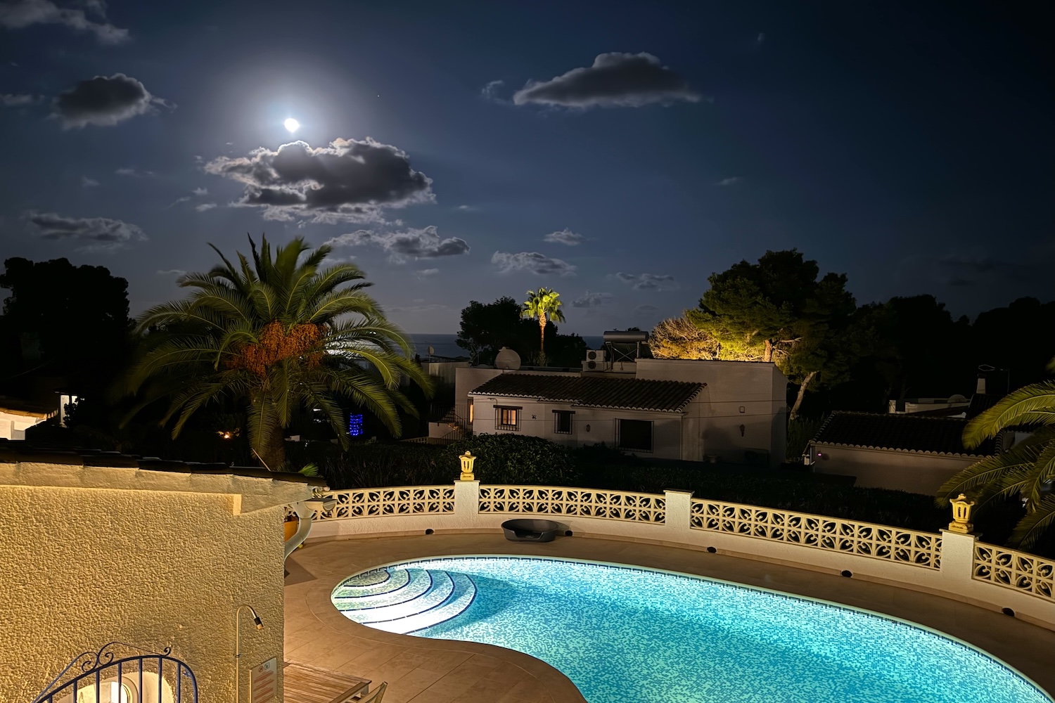 Enjoy your vacation under the Spanish sun! Summer or winter rental in Moraira, the Saint-Tropez of the Spanish Costa Blanca in our cozy largely renovated sea-view villa with private pool for 8 people. Or thinking about booking a safe holiday next summer in a private atmosphere with your family ‘bubble’? 4 bedrooms, 4 bathrooms, air conditioning cold and warm in all rooms. Beaches and cozy restaurants at 800 m. TV, internet, all modern comfort available. Fairytale private swimming pool with night lighting. Or relax on our sunny terraces and in the cozy shady corners in the garden. Beautiful BBQ and closed parking.